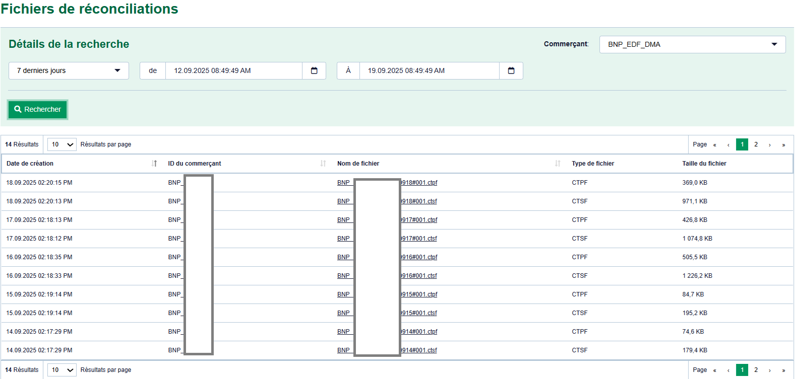 L'onglet « Ficher de réconciliation » se trouve sous l'onglet « Consulter les transactions ». Il vous permet de rechercher les fichiers de règlement sur une période donnée. Les fichiers de règlement affichent toutes les opérations d’un commerçant pour une période spécifiée.