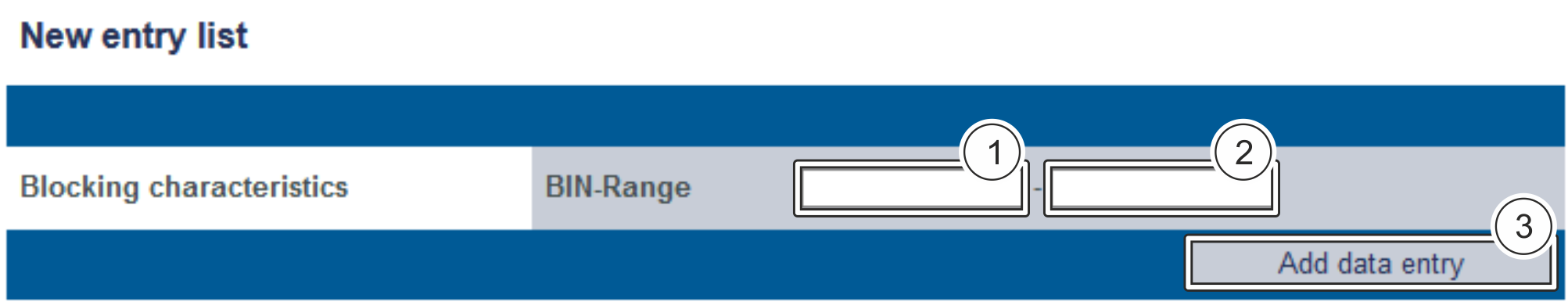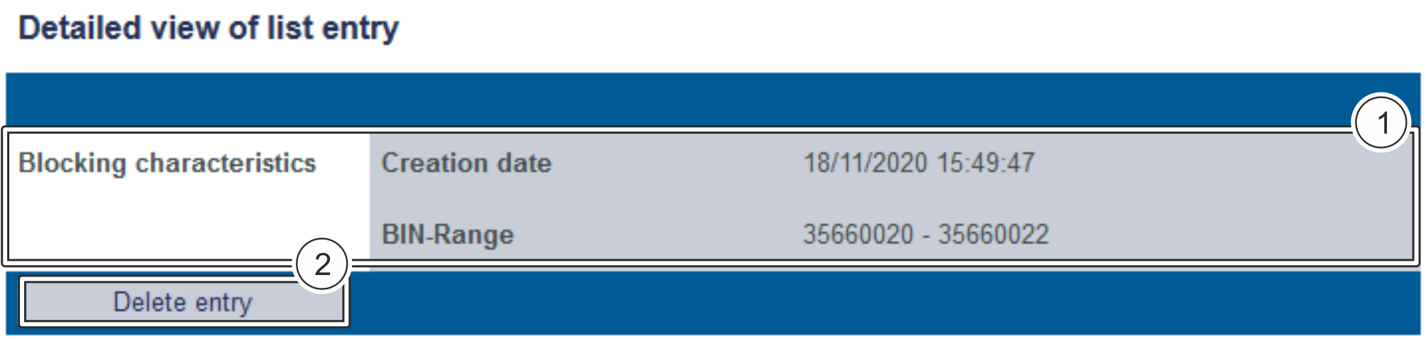 The "Blocking characteristics" selection field shows you the date of creation and the authorised credit card range for the list entry.