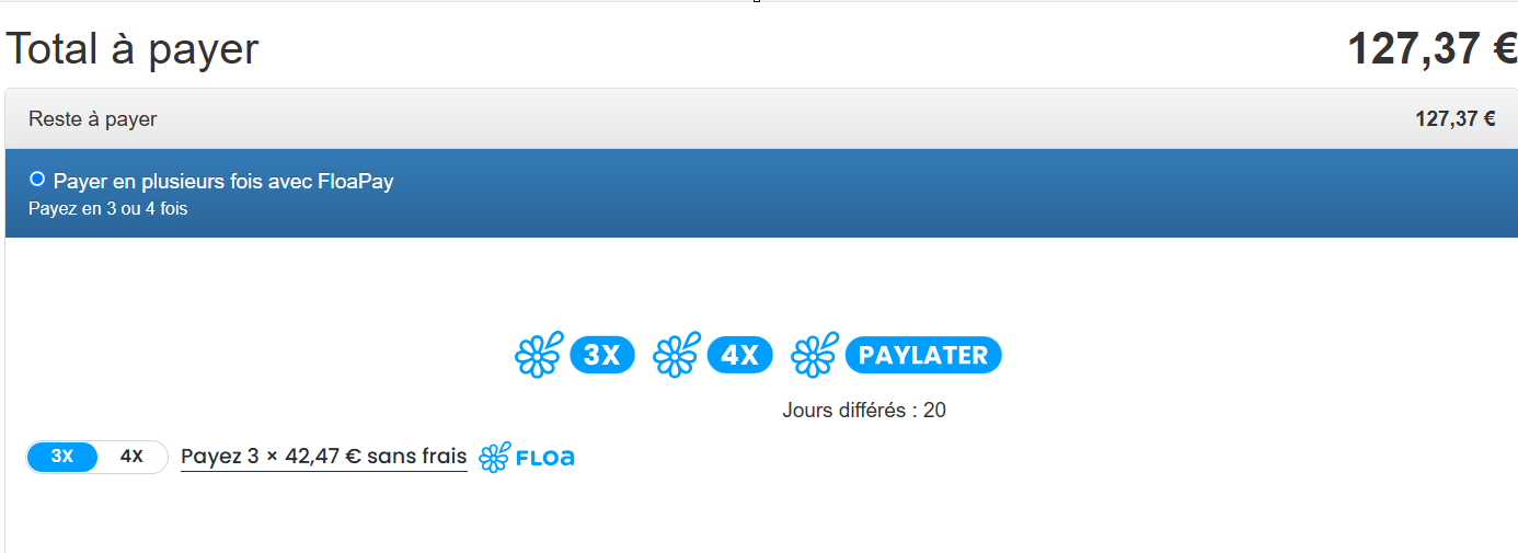 Pour mettre à disposition les moyens de paiement FLOA (Paiement différé/ 3X/ 4X) à vos clients, il faut configurer un nouveau connecteur depuis votre BO à l’adresse /admin.php/Rbs/Commerce/Connector/ et l’ajouter au moyens de paiements disponible dans votre processus de paiement.