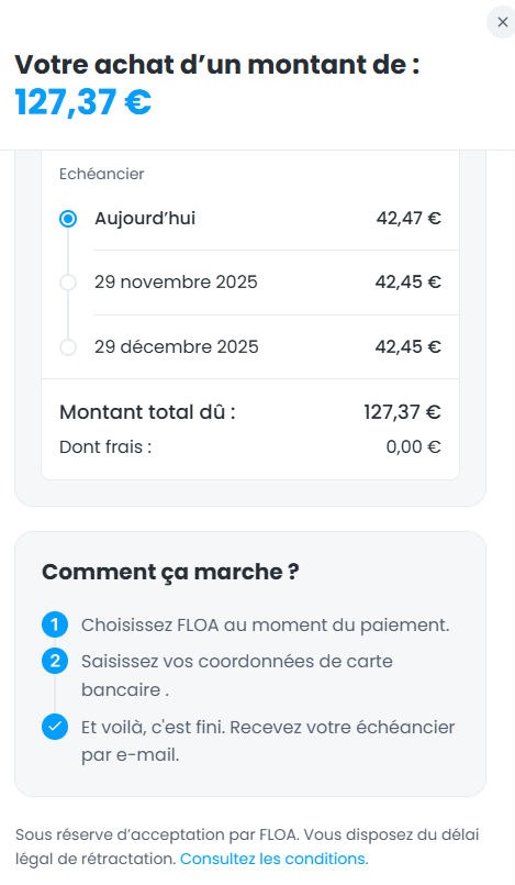 Au clic sur le curseur, l’utilisateur pourra visualiser le montant en 3 ou 4 fois. En cliquant sur 'Payez 3X' ou 'Payez 4X' , il pourra consulter le détail de l'échéancier, incluant les montants et les dates des échéances, comme illustré dans l'exemple ci-dessous.
