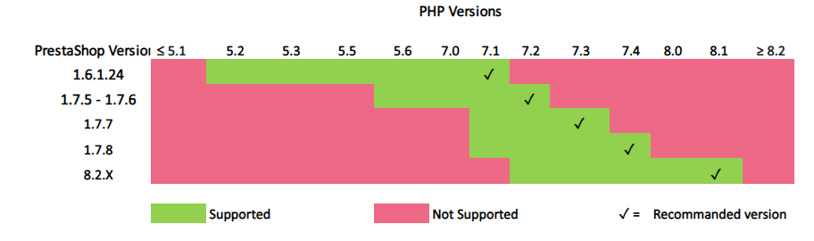 Les versions PHP requises sur chaque module :