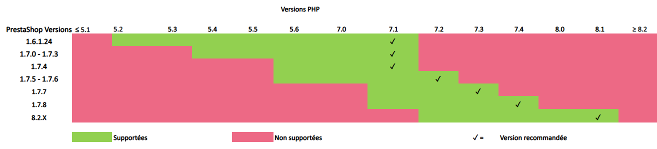 Les versions PHP requises sur chaque module :