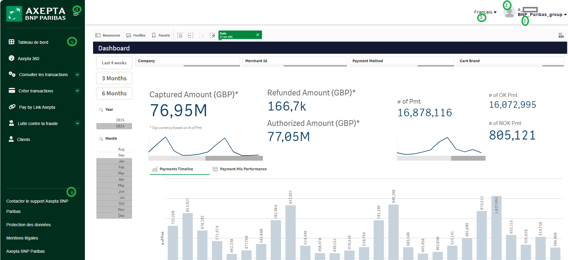 Le tableau de bord offre une vue complète de vos opérations de paiement, incluant toutes les transactions associées. Il présente les données clés sous forme de tableaux interactifs et de graphiques visuels, ce qui vous permet de suivre la performance sur des périodes personnalisables.