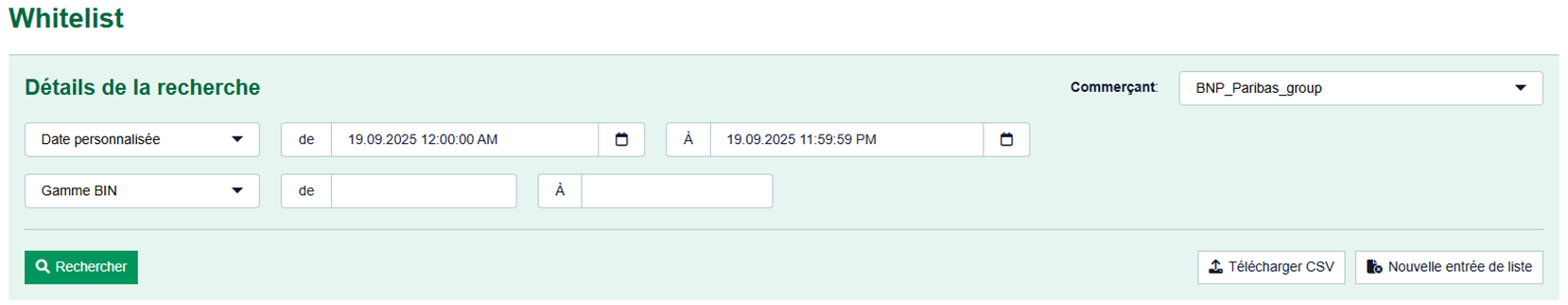 Vous pouvez utiliser l’onglet « Lutte contre la fraude » → « Whitelist » pour rechercher et filtrer les plages BIN autorisées.