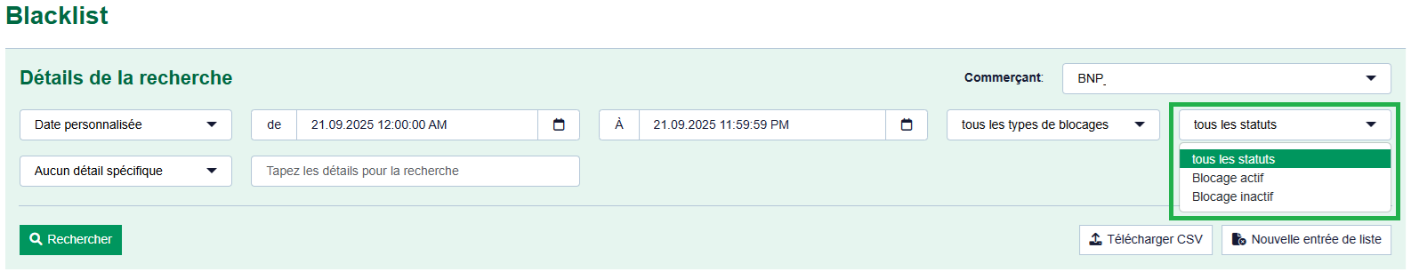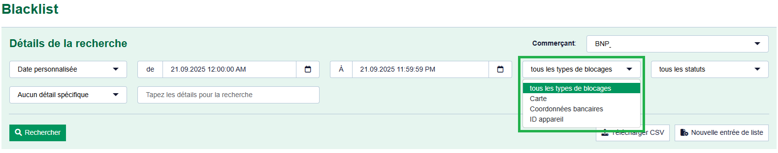 Vous pouvez utiliser l’onglet « Lutte contre la fraude » → « Liste noire » pour rechercher et filtrer les données de cartes, de comptes ou d’appareils mises sur liste noire. Cet onglet vous permet de définir des filtres selon la période et les caractéristiques de mise sur liste noire.