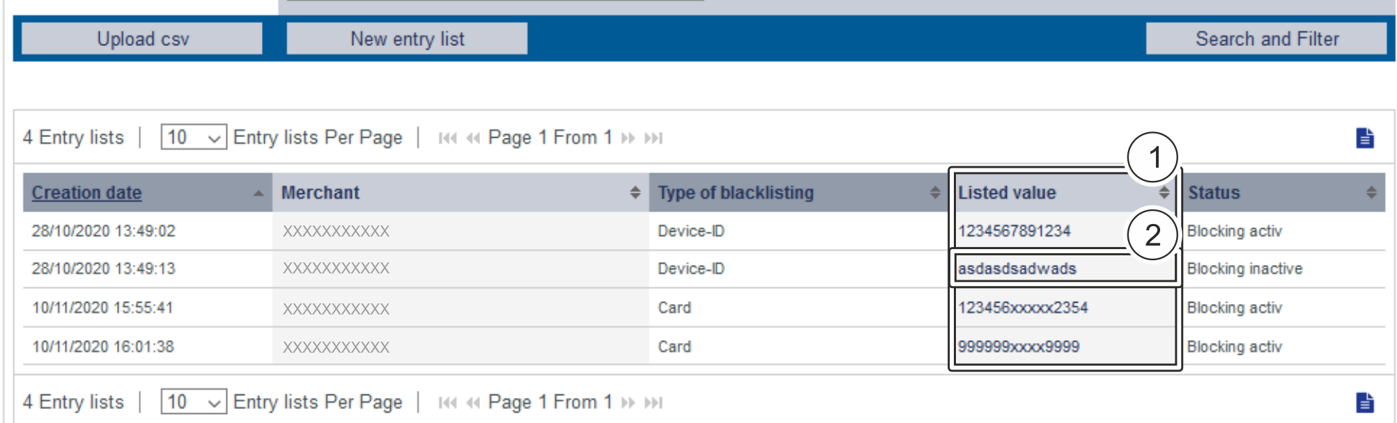 Operation characteristics show you the date of creation, the type of blacklisting with the corresponding card number, IBAN or device ID and the status of the list entry.