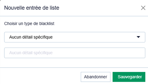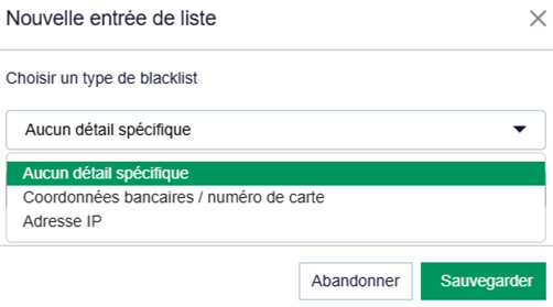 Coordonnées bancaires / Numéro de compte | Utilisé pour mettre en liste blanche un numéro de carte ou IBAN |