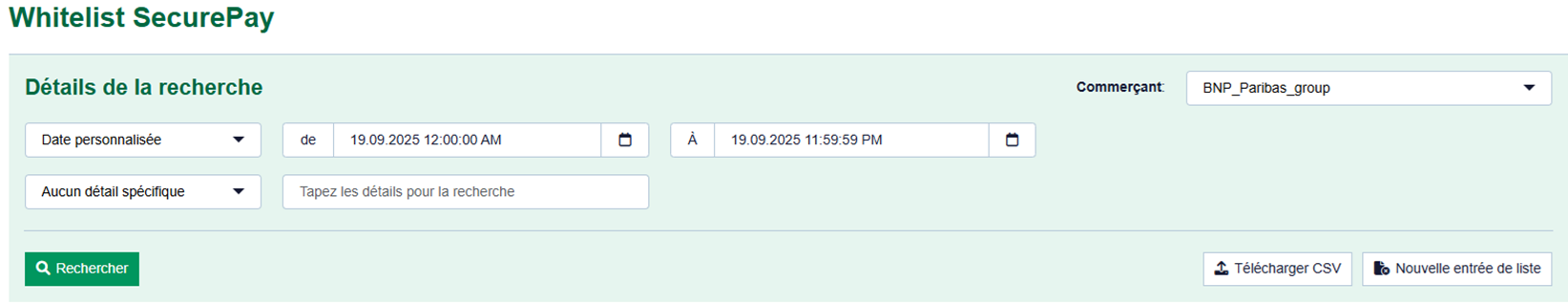 Vous pouvez utiliser l’onglet « Lutte contre la fraude » → « WhiteList SecurePay » pour rechercher, consulter et filtrer les données carte, compte ou appareil mises en liste blanche. Vous pouvez également exempter de nouveaux comptes, cartes ou appareils des contrôles de vélocité.
