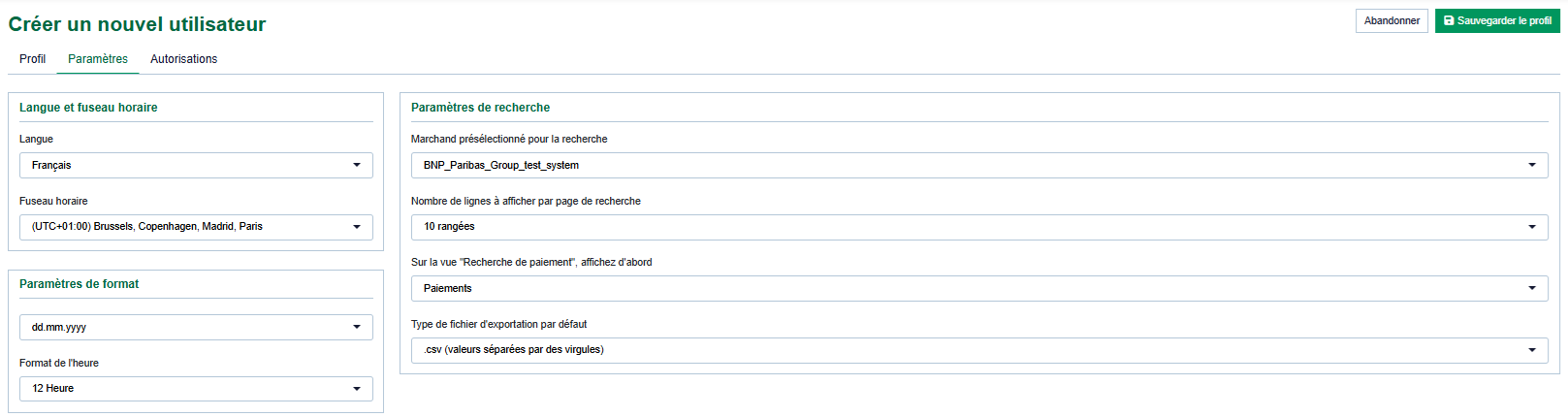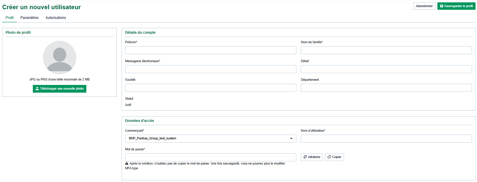 Vous pouvez utiliser le bouton "Créer un nouvel utilisateur" pour créer un nouvel utilisateur pour sur le portail marchand dans l’onglet "Administration → Gestion des utilisateurs". En créant de nouveaux utilisateurs, vous pouvez accorder l’accès à portail à plusieurs personnes. Cela présente l’avantage de vous permettre d’assigner des zones de responsabilité et de consulter les activités de chaque utilisateur dans le portail.