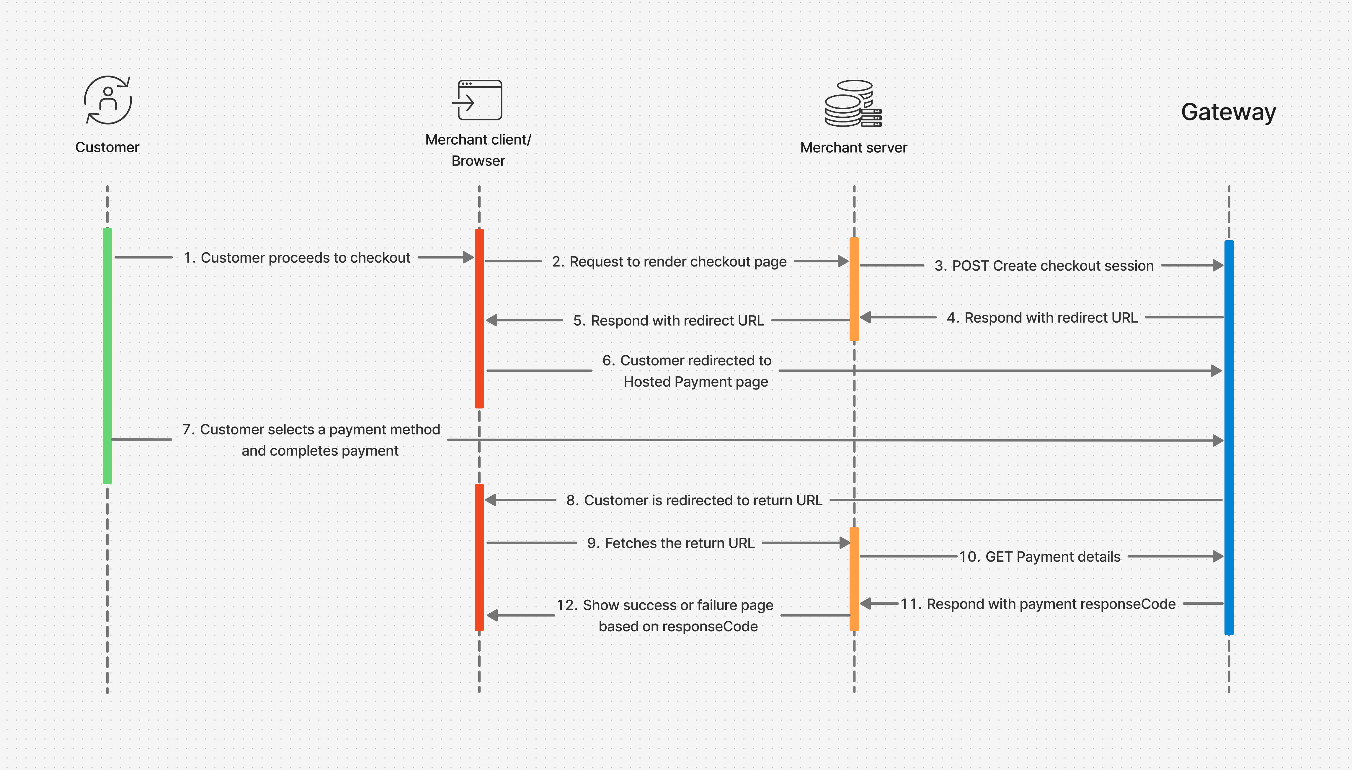 - À la fin, le client est redirigé vers l'URL de retour que vous avez soumise lors de l'appel Create checkout session (urls.return) avec le payId dans les paramètres de requête.