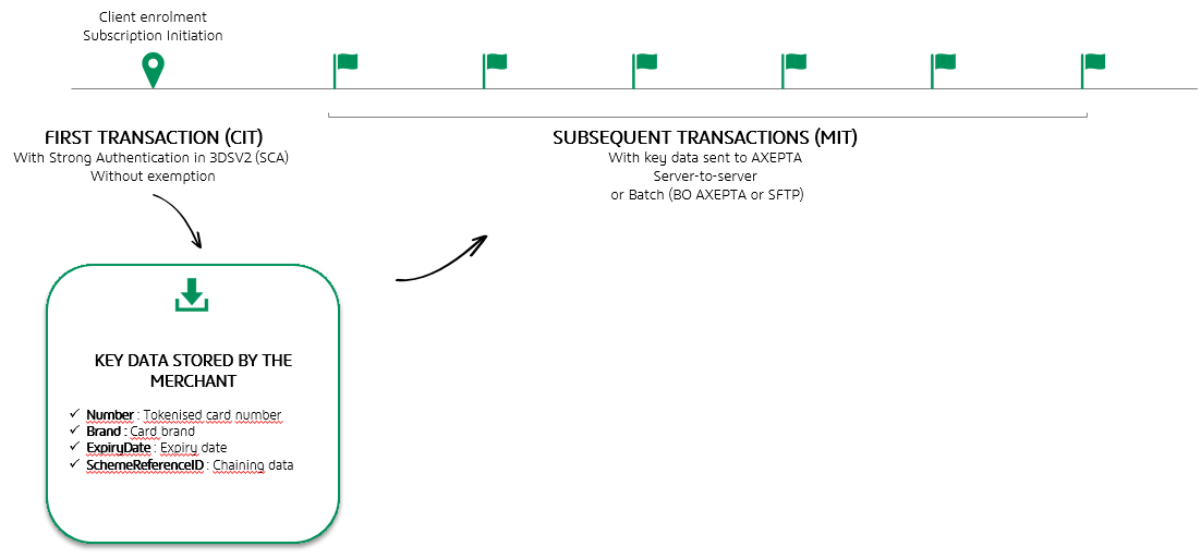 - First transaction (subscription initiation transaction) : Transaction strongly authenticated with 3DSV2 (SCA) without exemption request
