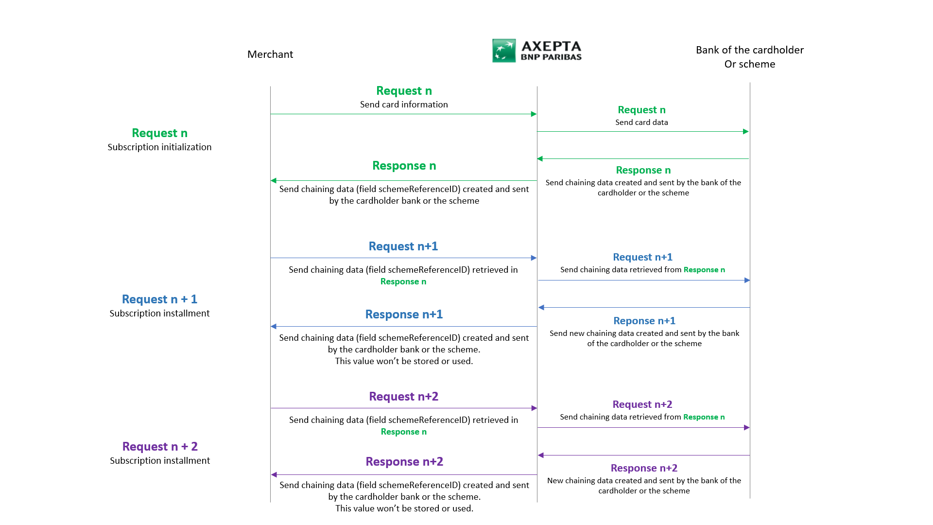 The chaining data, received in response to the subscription initialization, is generated either by the bank or by the scheme (Visa, Mastercard).
