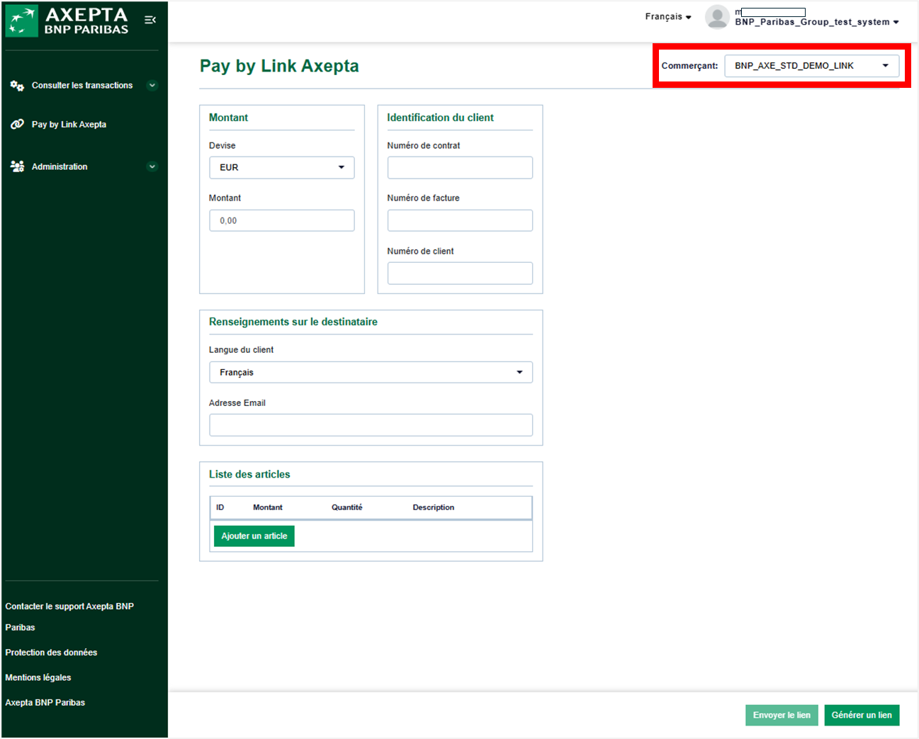 - Envoyer le lien (Facultatif) : Ce bouton, visible par les utilisateurs habilités, permet d'envoyer le lien de paiement par email. Il s'active dès que l'adresse email du client est saisie. L'envoi du mail est géré par Axepta.